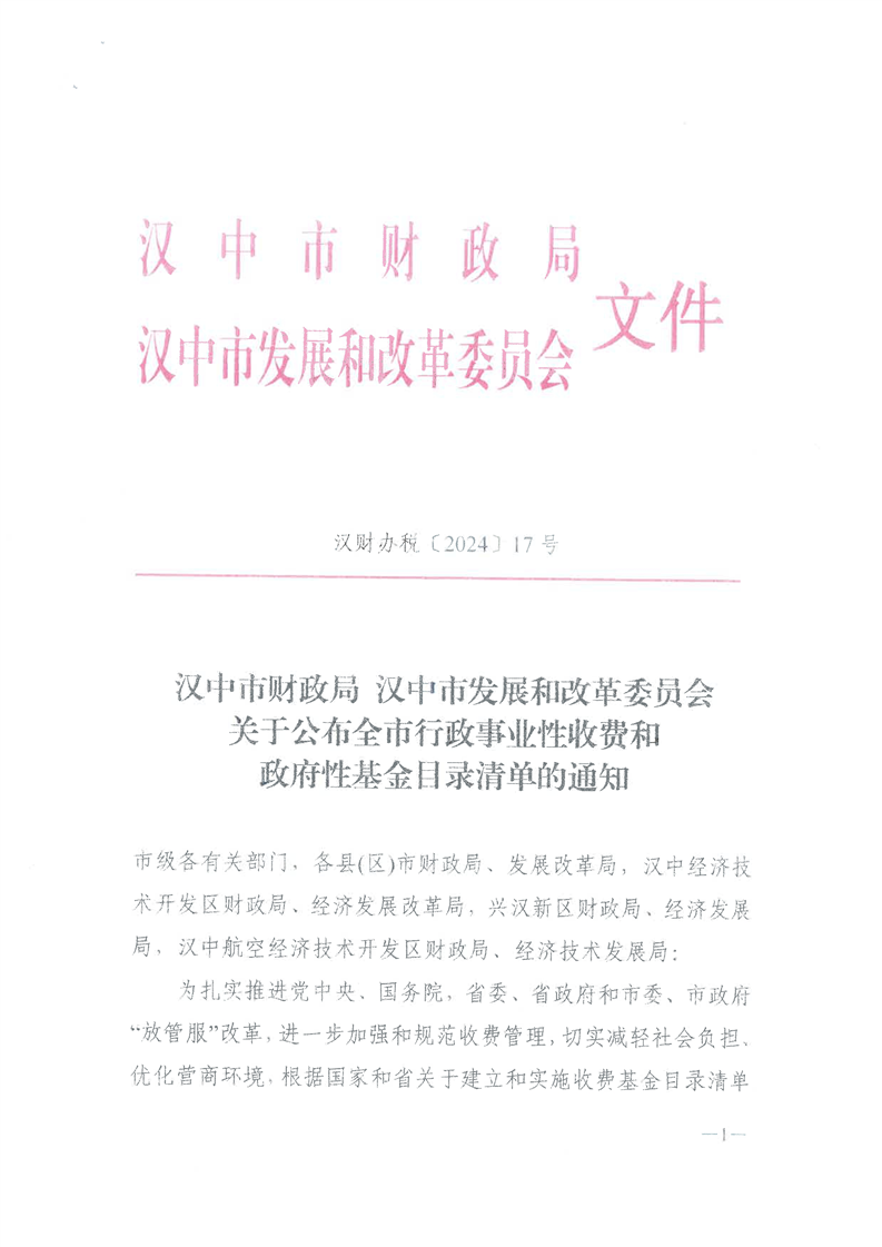 关于转发汉中市行政事业性收费和政府性基金目录清单的通知